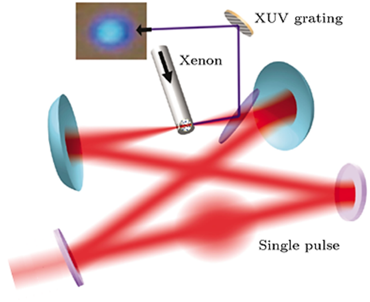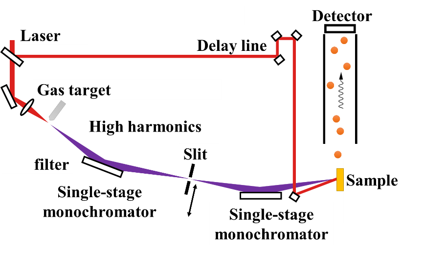 中国科学院物理研究所赵昆研究员团队使用双色场配合脉冲后压缩得到了目前Tr-ARPES样品测量的最高光子通量。他们使用四片熔融石英薄片配合啁啾镜组,依靠自相位调制的光谱展宽效应和色散补偿实现了驱动激光的二次压缩。并在将驱动激光进行倍频后,对双色场进行了延时调节,配合紧聚焦配置使用氪气产生了高通量的高重频极紫外光源。