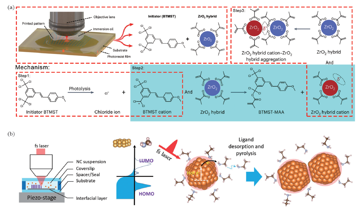 胶体纳米颗粒通常由功能核心以及表面配体组成,其在溶液中稳定分散的能力往往由表面配体所决定,如果表面配体脱附,纳米颗粒核心在溶液中无法维持分散状态,容易形成团簇失稳,从而形成沉淀。研究人员通过光诱导ZrO2纳米颗粒表面配体脱附形成带电颗粒,如图3(a)所示,以2,4-双(三氯甲基)-6-对甲氧基苯乙烯基-S-三嗪(BTMST)为光引发剂与甲基丙烯酸配体修饰的ZrO2纳米颗粒形成ZrO2-BTMST杂化物。在光辐照下,BTMST光解并与ZrO2纳米颗粒表面配体相互作用,破坏了颗粒表面电荷屏蔽层,ZrO2颗粒聚集后,溶解度降低,实现纳米结构打印。对于金属纳米颗粒而言,飞秒激光能直接实现表面油酸配体脱附热解,进而使纳米颗粒间定向组装,完成三维结构制造,如图3(b)。同样的,光诱导纳米颗粒表面配体脱附并非是一个通用性方法,具体机理会因纳米颗粒以及表面配体种类性质变化而变化,使其难以满足于具有丰富种类的胶体纳米颗粒库。