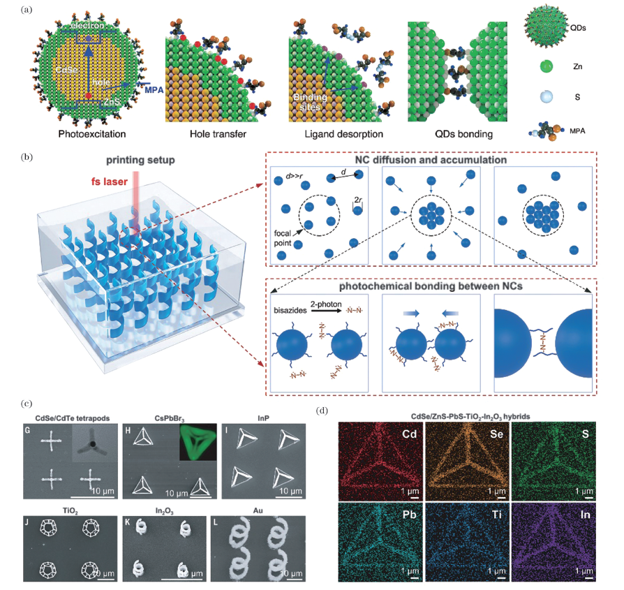 通过激光诱导纳米颗粒间化学键合,能提升颗粒间的结合力,为纳米颗粒三维结构制备提供较强的机械支撑作用。2022年,清华大学精密仪器系孙洪波、林琳涵课题组首次提出光激发诱导化学键合技术,这项技术利用光生载流子调控纳米颗粒表面配体活性,实现了半导体、金属胶体纳米颗粒间的化学键合及3D纳米打印。具体过程以量子点为例:光激发量子点后产生激子,激子分离形成的空穴通过能级适配转移到纳米晶体表面,诱导硫醇配体通过氧化还原反应脱附。配体脱附后,会在纳米晶表面暴露出未成键的活性位点,与相邻颗粒表面配体成键,从而实现纳米颗粒间成键、组装及打印。这表明在合适的颗粒-配体能级设计下,可以适用于多种纳米颗粒体系的三维微纳结构制备。如图4(a)所示。这项技术可以实现超越光学衍射极限的制造,其打印线宽最小可达77 nm。纳米像素画结构的显示分辨率能达到20000 ppi,展现出了在集成光电子及超分辨显示等方面的应用可能性。此外,该技术无需共混、烧结等复杂的前处理及后处理过程,能够维持纳米颗粒原有特性,有望用于制备高分辨QLED、集成光电探测器、太阳能电池等光电器件。