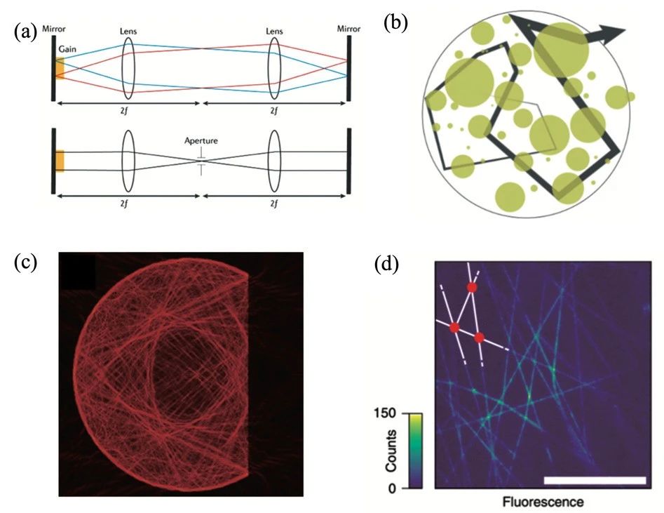 图1 (a) 简并腔激光器;(b) 随机激光器;(c) 混沌激光器;(d) 光子网络激光器