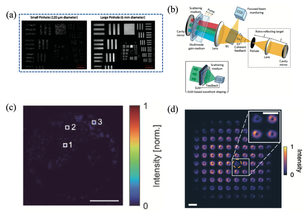 图2 基于简并腔多模激光器的新型应用。(a) 消散斑成像;(b) 波前整形;(c) 相干完美吸收;(d) 涡旋缺陷自愈