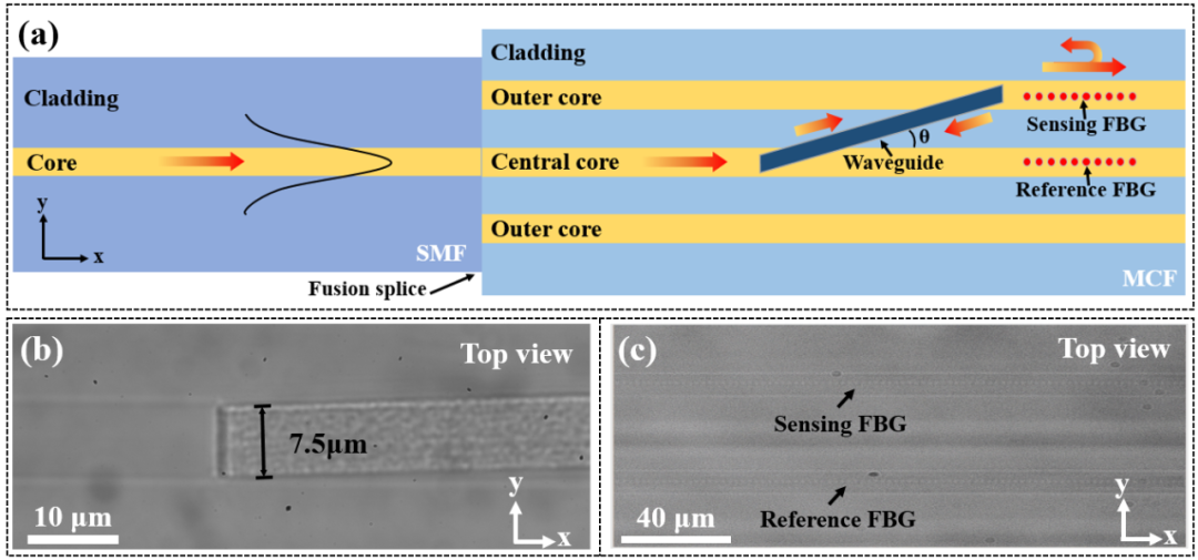 图1(a)展示了所制备传感结构的应用原理。通过简单地将单模光纤(SMF)的纤芯与七芯光纤(MCF)的中间芯熔接,光信号即可从中间芯通过波导传输到侧芯中,在经过FBG的反射后,再次通过波导返回至中间芯,最终反射回单模光纤中。一旦FBG的反射信号由于光纤发生弯曲等变化而变化,则可以通过单模光纤中传输回来的光进行解调,从而获得低成本、低复杂度和高紧凑性的光纤矢量位移传感结构。图1(b)和图1(c)分别展示了所制备的耦合波导和FBG的俯视显微形貌图。