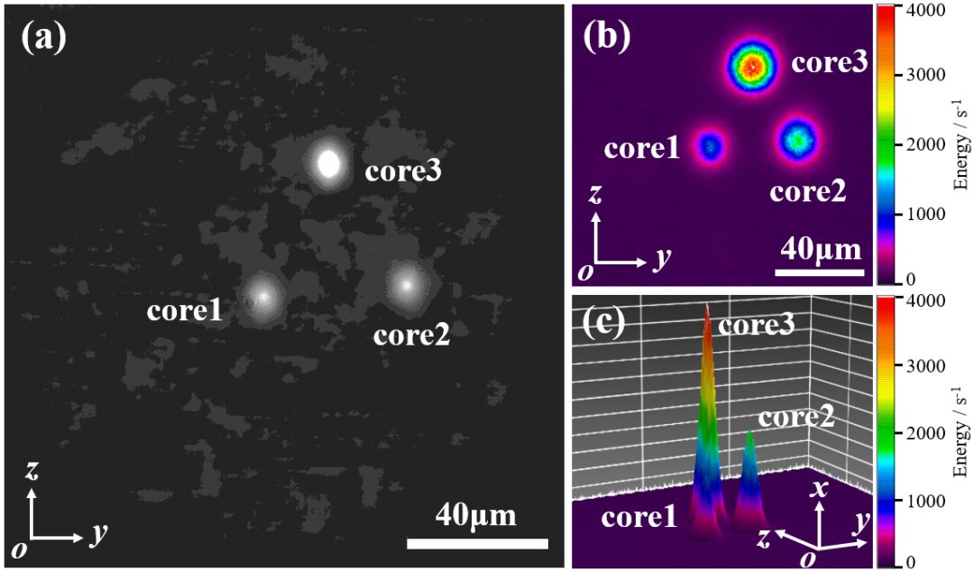 图2 通过黑白CCD和彩色激光光束分析仪得到的七芯FBG及耦合波导结构的端面出光分布。(a)黑白CCD成像结果;(b)彩色二维模场分布;(c)彩色三维模场分布