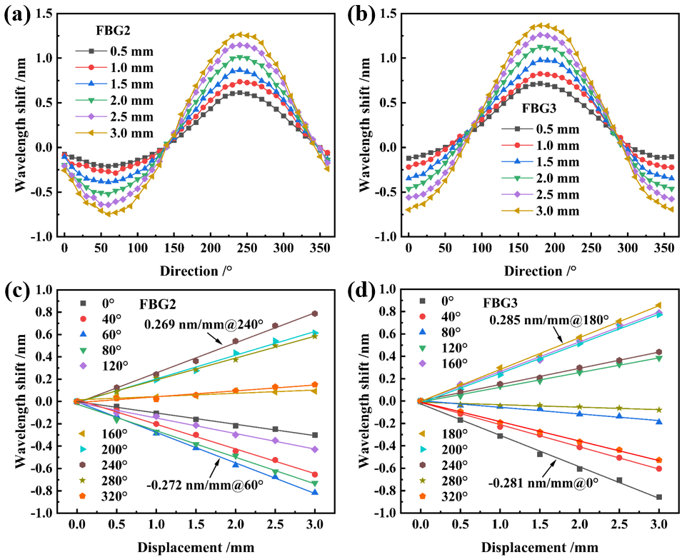 图3 传感结构的位移方向及位移响应。(a)在不同位移量大小下FBG2的位移方向响应;(b)在不同位移量大小下FBG3的位移方向响应;(c)在不同位移方向下FBG2的位移响应;(d)在不同位移方向下FBG3的位移响应