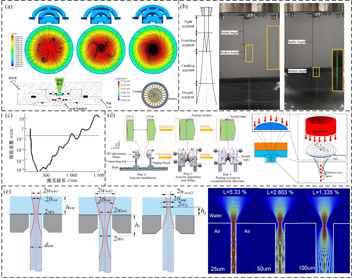 图2 激光-水射流耦合传输过程分析。(a) 流道结构优化;(b) 气体辅助下的水射流传输状态;(c) 同一温度下水对不同波长激光的吸收率;(d) 光路整形技术;(e) 光水耦合误差与耦合效应研究