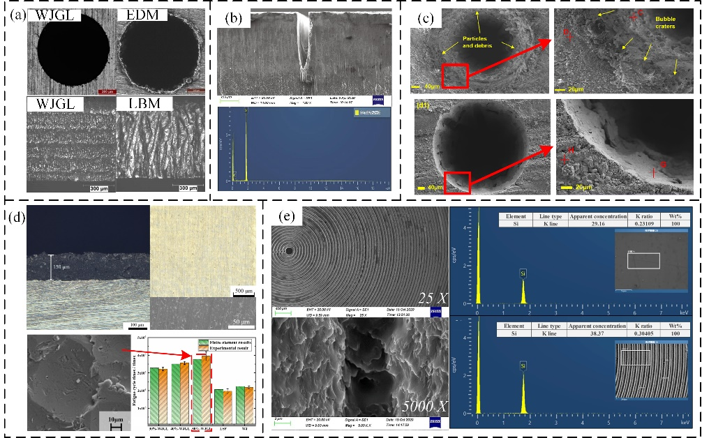图3 水导激光加工应用。(a) 水导激光(WJGL)与电火花(EDM)、常规激光(LBM)加工效果对比; (b) 单晶Si水导激光划槽形貌;(c) SiC/SiC复合材料水导激光与飞秒激光制孔加工对比;(d) 材料清洗与材料强化;(e) 单晶Si水导激光表面改性增加亲水性