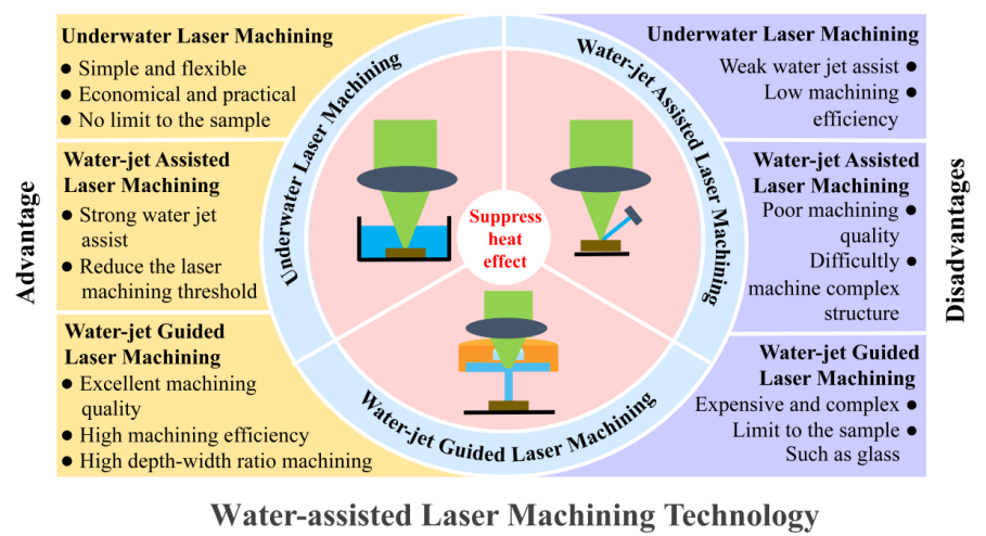 水射流辅助激光加工技术通过高压水射流与激光的协同作用,高速水射流产生的瞬时剪切应力可有效剥离激光软化层,使材料去除效率显著提升,并且由于水的冷却显著提升了微通道加工质量。