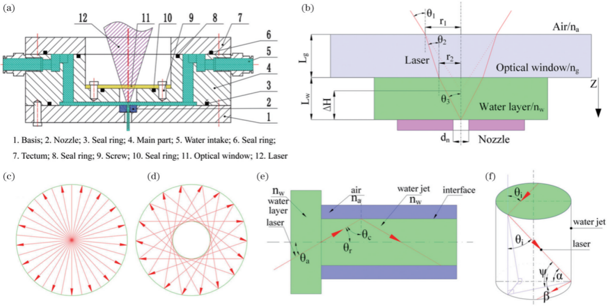而水导激光加工设备中具有许多复杂的工程问题。其中激光耦合器是整个水导激光耦合系统的关键组成部分,其结构如图2所示。高压水通过两侧的进水口进入激光耦合器,最后从水腔底部中心的喷嘴射出,形成水射流。激光在耦合到水射流的过程中,需要经过如图2(b)所示的三个不同的介质层:空气、光学窗口和水层。由物镜聚焦的激光经过两侧折射后最终以角度 θ3耦合到喷嘴的入口端面,然后在满足全反射的条件下,通过水射流形成的水束进行传输。