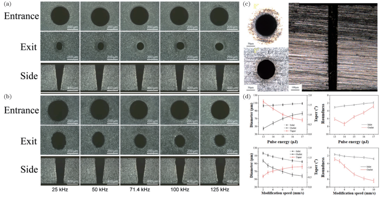 江苏大学的任乃飞教授等利用单脉冲能量为120 μJ的飞秒激光对厚度为1 mm的氧化铝陶瓷进行通孔加工。图3(a)和(b)分别展示了在空气与水下加工通孔的入口图、出口图与截面图。他们的研究发现了在水下加工时,当脉冲重复率大于 50 kHz 时,随着脉冲重复频率增加,产生的等离子体增多,受水约束的等离子体相应增加,等离子体的屏蔽效应增强,减弱了水辅助效果,从而导致孔截面锥度增大,孔质量相应下降。