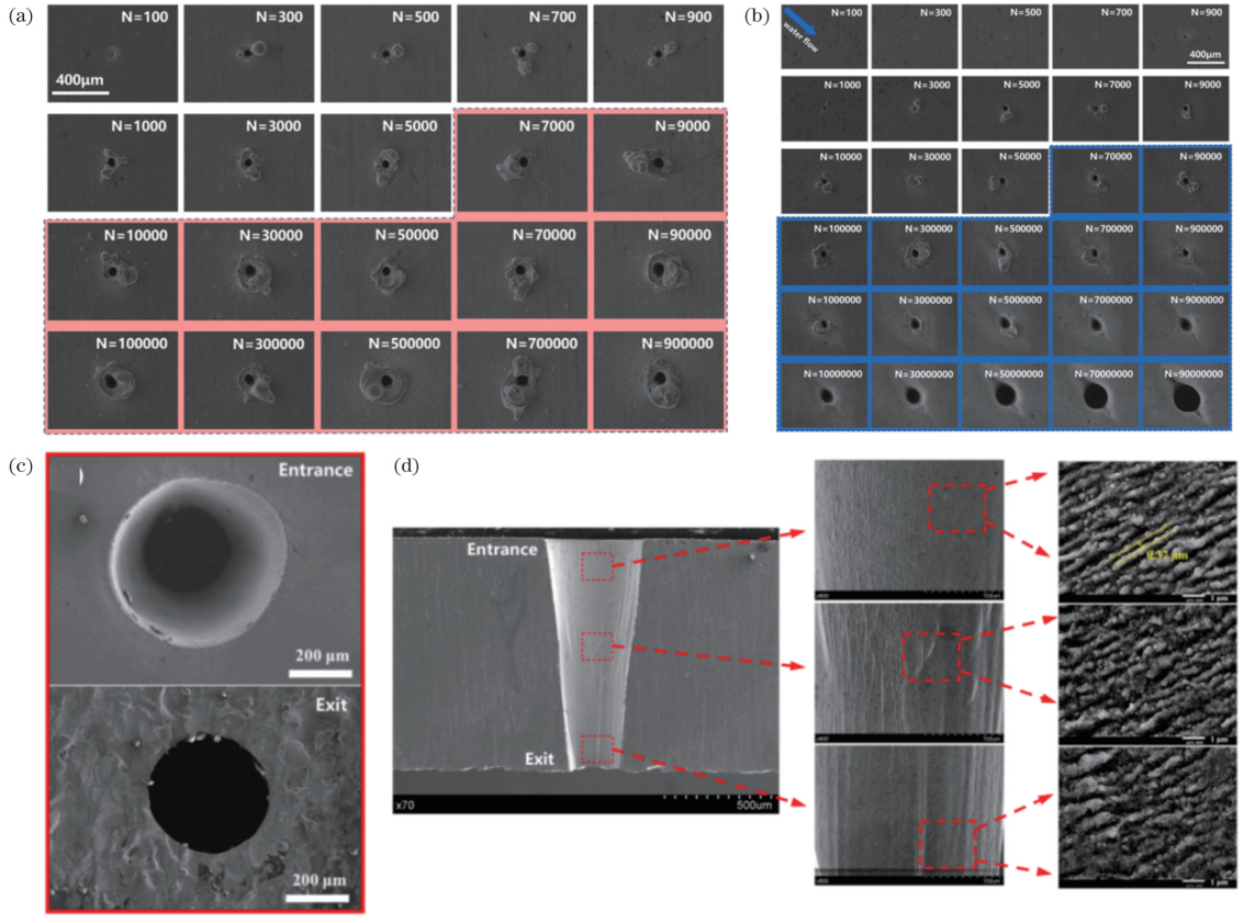 南京农业大学的章永年教授等利用波长为532 nm、脉宽10 ps的激光对304不锈钢进行加工,通过水辅助的方法获得了高纵深比的通孔结构,如图3(c)所示。由图3(d)可以看出,随着激光能量增大,通孔的锥度减小。揭示了随着脉冲能量增加,激光在水中引起的等离子体密度增大,从而产生更强大的冲击波,提高了材料的去除率。