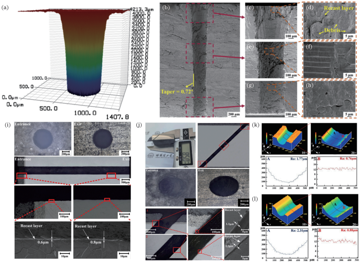 哈尔滨工业大学的杨立军教授等使用水导激光在厚8.5 mm的TBC合金上实现了高质量的45°倾斜通孔制备,其深径比可达20,如图5(i-l)所示。斜孔在入口处没有明显的陶瓷破碎,在出口处没有明显的金属毛刺。内表面的热屏障涂层、黏结层和基底层之间无缝过渡,没有明显的缺陷或界面分层。证明了水导激光在复合材料加工领域的强大能力。