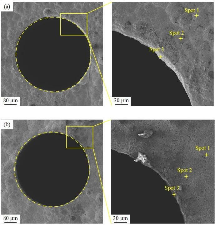针对SiCf/SiC陶瓷基复合材料气膜孔所面临的精密加工需求,大连理工大学董志刚教授团队开展了水导激光环切制孔工艺研究,深入探究了激光单脉冲能量、扫描速度及水束压力等关键工艺参数对小孔出入口形貌、锥度的影响规律,成功实现了直径为500 µm、深径比为8 的近无锥度小孔的高质高效加工,如图1和图2所示。这一研究成果可为后续水导激光加工SiCf/SiC 陶瓷基复合材料气膜孔提供了可靠的工艺支撑。