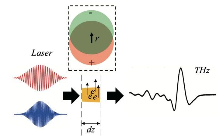 图1 太赫兹辐射产生的关键物理过程:原子电离、等离子体偶极振荡和辐射产生
