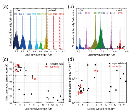 图1(a)4 μm ICL的光谱;(b)8 μm ICL的光谱; InAs基ICL的(c)最高工作温度与激射波长关系;(d)阈值电流密度(@ 300 K或最高工作温度)与激射波长关系