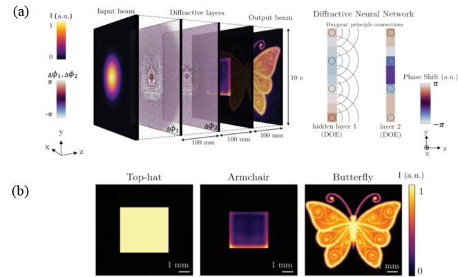 随着制造品质需求不断提升,传统高斯光束单点加工方式难以满足当前激光微纳结构制造的高精度、高效率和跨尺度加工要求。因此需要利用光束整形技术调整光束的焦点、形状、强度分布,将光束轮廓塑造成特定的形状。随着光场所需特性的复杂性不断增加,此类系统的设计面临着许多挑战。相较传统方法,人工智能算法能够更加快速准确地实现复杂光场的调制。如图2所示,亚琛工业大学Buske等人通过衍射神经网络算法,将光束能量分布调整为平顶光、扶手椅和蝴蝶形状。此外,同济大学李鹏忠团队使用人工神经网络对U-Net神经网络算法进行改进,用于基于空间光调制器(SLM)的光束整形优化。