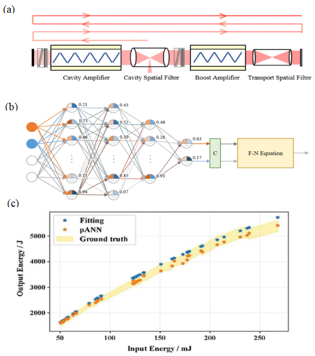 图1 利用深度神经网络进行主放大器输出能量的预测。(a)主放大器内部光路及主要模块;(b)光束输入和输出能量关系;(c)预测结果及拟合方法[1]