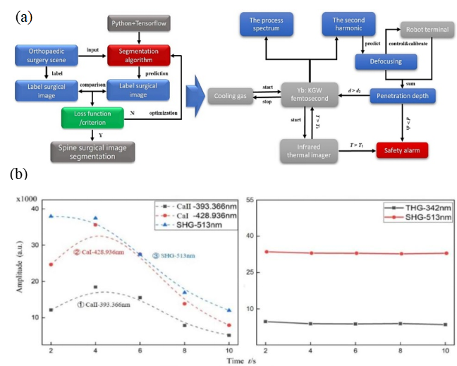 北京航空航天大学激光团队利用光谱仪采集加工过程中产生的二次谐波信号用于定位和监测,实现了基于光谱响应的工艺参数优化(图4)。在此基础上,本团队在飞秒激光钻骨过程中使用卷积神经网络对光斑位置进行精准定位,展现了该方法在提升手术安全性方面的潜力。