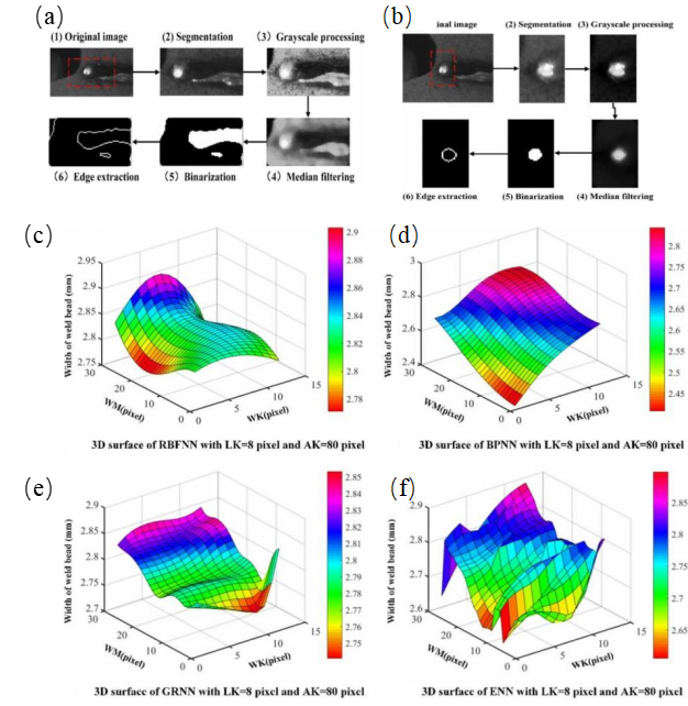 激光焊接技术是激光制造领域应用最为广泛的技术之一,具有能量密度高、热影响区小、焊缝深宽比大、自动化程度高等优点。研究熔池和焊缝的特点可以帮助提升激光焊接的质量和效率。利用人工智能快速分析熔池的几何形态、深度、宽度以及熔池与基材之间的界面特征等参数,可以评估焊缝的质量,并优化焊接参数以实现所需的焊缝形态和性能。华中科技大学蒋平教授团队使用图像处理技术提取激光熔池和小孔的特征,将多种神经网络集成来建立激光熔池、小孔特征与焊缝特征之间的关系(图5)。广东工业大学高向东团队基于传感器信号特征构建了用于焊缝缺陷检测的支持向量机(SVM)分类模型,可利用光学特征对焊接缺陷进行有效检测。