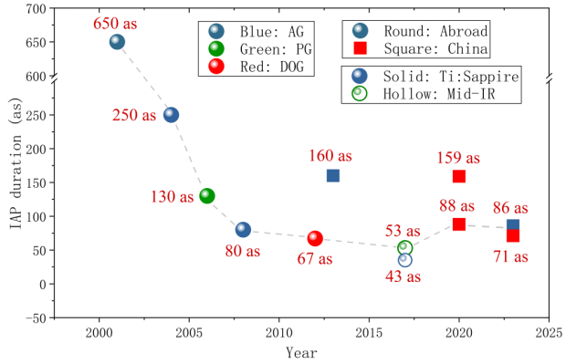 2001年,P. Agostini小组产生了脉冲宽度250 as的13~19阶高次谐波的阿秒脉冲串。同年,F. Krausz小组得到了脉宽650 as的单个阿秒脉冲,标志着超快研究进入阿秒领域。其后20多年来,阿秒脉冲脉宽被不断压缩,国内外的单个阿秒脉冲产生研究均取得重要进展(见图1)。2023年,美国科学家Pierre Agostini、德国科学家Ferenc Krausz和瑞典科学家Anne L’ Huillier被授予诺贝尔物理学奖,以表彰他们在实验上产生阿秒脉冲串及单个阿秒脉冲,以及将阿秒脉冲用于研究物质中电子动力学过程的巨大贡献。