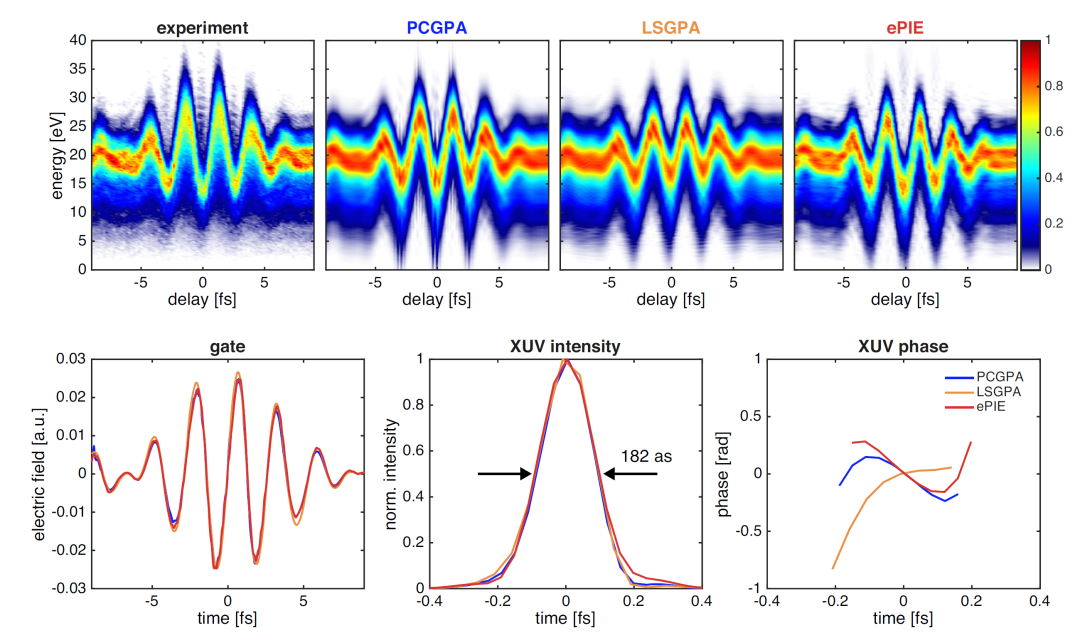 在FROG-CRAB算法基础上,为了克服其傅里叶变换带来的精度和谱宽限制,并提高反演算法的迭代速度,Lucchini等首次将ePIE应用于表征阿秒脉冲,并扩展到反演紫外至极紫外的宽带阿秒脉冲振幅和光谱相位。
