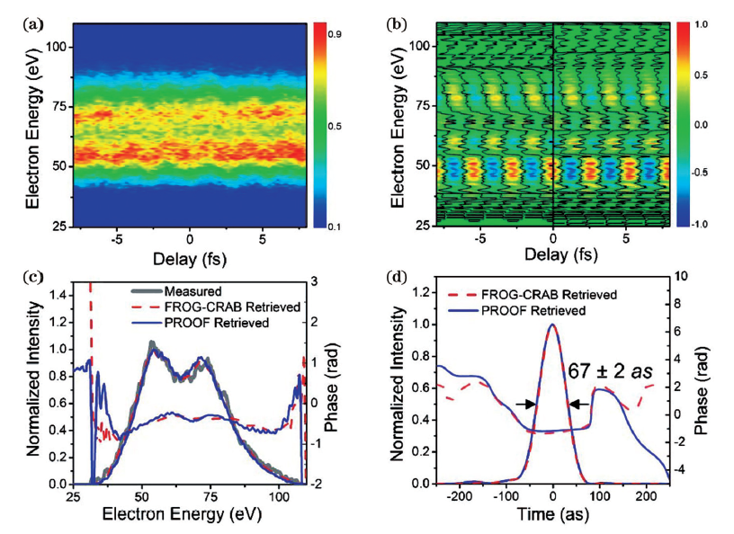 为了克服中心动量近似的局限性,Chini等于2010年提出基于单频滤波的宽带阿秒脉冲表征算法PROOF,该算法能够在弱调制场(<1012 W/cm²)条件下反演宽带阿秒脉冲。相较FROG-CRAB,PROOF方法更为简洁,该方法只考虑单光子调制项,降低了反演复杂度,更适合宽带光谱、弱光强调制的阿秒脉冲反演。如图3所示,常增虎课题组于2012年报道了使用7 fs近红外脉冲结合双光学门技术,获得55~130 eV超连续光谱,采用PROOF表征脉宽为67±2 as的单个阿秒脉冲,与FROG-CRAB反演结果互相印证。