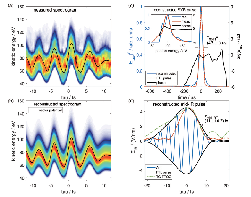 当阿秒脉冲谱宽延伸到软X射线频段时,产生和测量阿秒脉冲都会存在更复杂的物理过程。Gaumnitz等研究了多个束缚态电子电离对阿秒能谱的非相干贡献,提出了多线VTGPA(ML-VTGPA)算法,并在实验上使用中红外驱动电场作用于氙气得到覆盖65~150 eV的宽带阿秒能谱。最终反演得到τSXR=43±1 as的软X射线波段超短阿秒脉冲,如图4所示。