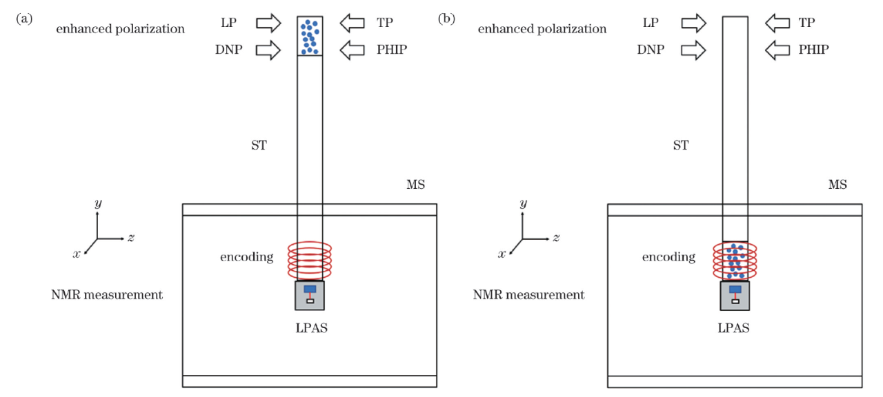 对于零场-超低场NMR,在测量区原位热极化产生的磁化矢量强度比高场下产生的要低5个数量级以上。强磁场TP、动态核极化(DNP)、激光极化(LP)和仲氢诱导极化(PHIP)等极化增强技术的应用,极大地提高了零场-超低场 NMR 样品的宏观磁化矢量,拓宽了零场-超低场NMR的应用范围。图1为基于LPAS的NMR测量原理图。