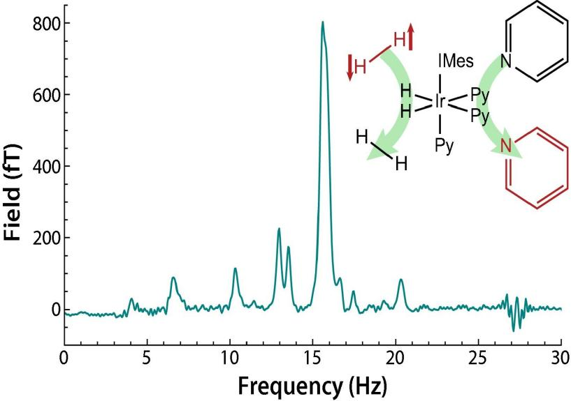 图2 商用LPAS测量的经SABRE极化的天然同位素丰度15N-吡啶的零场NMR波谱,内插图为SABRE的反应过程示意图(源自Journal of Magnetic Resonance, 2020, 314: 106723)