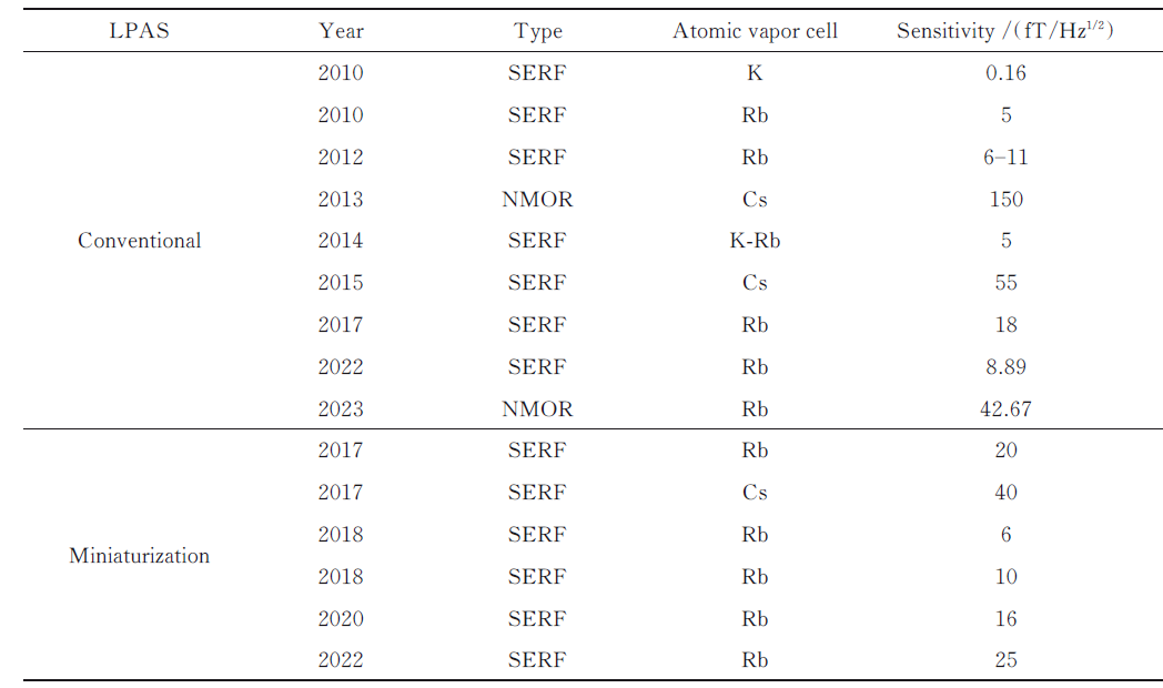 近年来,研究人员尝试通过不同的方法来提升LPAS的灵敏度等技术指标。2010年,普林斯顿大学Dang等实现了钾原子SERF型LPAS,其灵敏度达到了0.16 fT/Hz1/2,这是现有灵敏度最高的LPAS。2018年,Quspin公司开发了第一代商用小型铷原子LPAS,探头尺寸13×19×110 mm3,其灵敏度可以达到10 fT/Hz1/2。