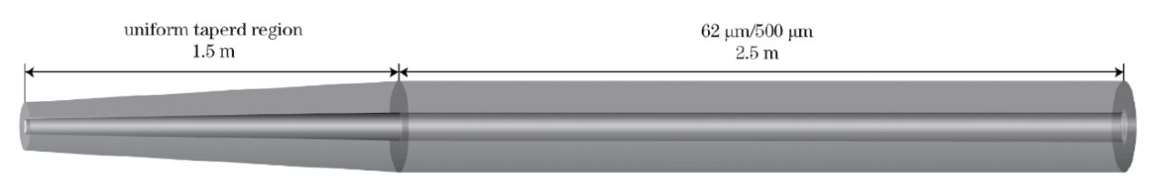 目前,脉冲光纤激光器输出功率的提升主要受限于放大自发辐射引起的寄生振荡和高峰值功率引起的受激拉曼散射(SRS),采用大模场面积掺镱光纤可以有效抑制SRS效应,实现较高的功率与单脉冲能量,但较大的纤芯直径可以传输较多的高阶模式,导致光束质量退化。国外已报道采用短锥实现了高峰值功率和高光束质量的脉冲激光输出,但采用空间光路耦合,光路结构复杂且短锥制备比较困难。此外,自由空间结构或多路全光纤合束技术也是实现千瓦级纳秒脉冲激光的有效方法,其输出性能受限于单纤纳秒脉冲激光性能。因此,提升单纤纳秒脉冲激光输出性能,抑制SRS效应和光束质量退化,研究用于高功率脉冲激光放大器的大芯径锥形掺镱光纤,同时实现高平均功率、高单脉冲能量、高光束质量的脉冲激光输出具有重要意义。