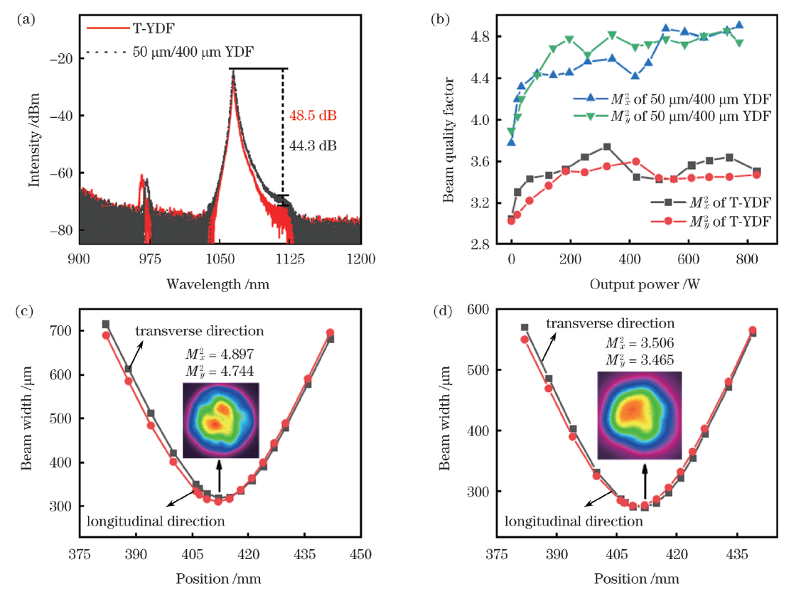 图2 T-YDF与50/400 μm YDF输出特性的对比。(a)最大输出功率下的光谱;(b)不同输出功率下的光束质量因子;(c)50/400 μm YDF在最大输出功率下的光束质量因子;(d)T-YDF在最大输出功率下的光束质量因子