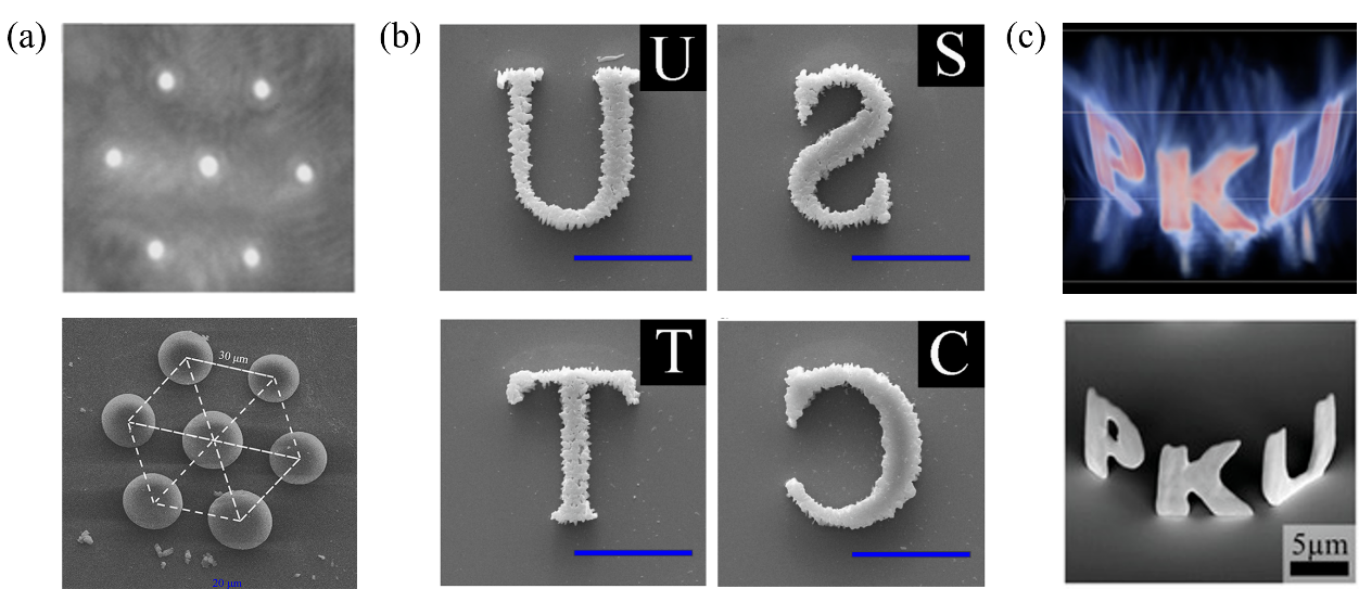 图 1 基于迭代算法光场调制方法高效制备三维微纳结构。(a)多焦点阵列并行加工微透镜阵列;(b)二维面光场单次曝光加工“USTC”字母;(c)三维体光场单次曝光加工“PKU”字母
