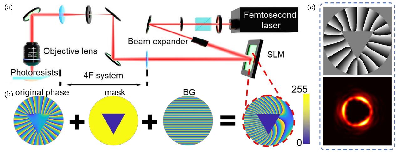图3(a)空间光调制器辅助的飞秒激光双光子加工系统;(b)空间光调制上的加载相位;(c)离散涡旋光束全息图及聚焦光斑