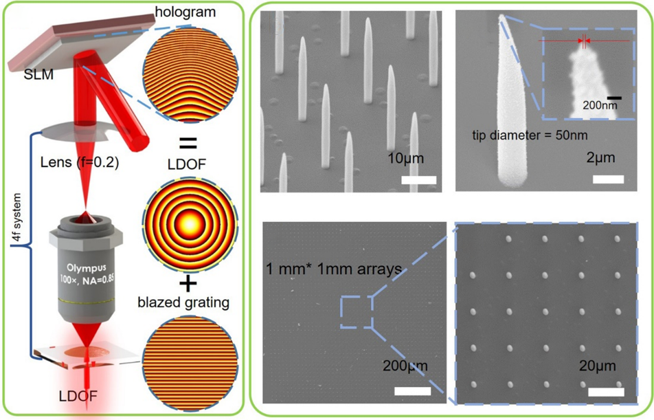 中国科学技术大学微纳米工程实验室激光加工团队将基于SLM的全息光场调控技术与飞秒激光加工技术相结合,利用液晶空间光调制器将高斯分布的飞秒激光调制成多焦点阵列、贝塞尔光、涡旋光和艾里光等结构光场,用于多功能微纳米器件的高效加工。该技术方案能够在保留飞秒激光高分辨率、真三维加工能力的基础上极大地提高飞秒激光的加工效率。
