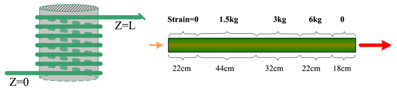 光纤放大器中的SBS效应建立于反向Stokes光增益沿光纤轴向的快速积累,因此,研究人员提出沿光纤轴向调控Stokes光增益谱来抑制SBS效应的方法。实验中可对有源光纤施加温度和应力梯度实现对Stokes光频移的调控,降低反向Stokes光增益积累,从而达到提高SBS阈值的目的。研究人员在1540 nm脉冲单频光纤放大器实验中,通过对功率放大级1.4 m长的25/250 μm保偏铒镱共掺光纤施加如图2所示的应力梯度,实现了脉冲能量540 μJ、峰值功率1.08 kW的500 ns脉冲单频激光输出。但需指出的是,这一技术方案在实际应用中仍面临环境适应性、稳定性以及系统集成度等问题。