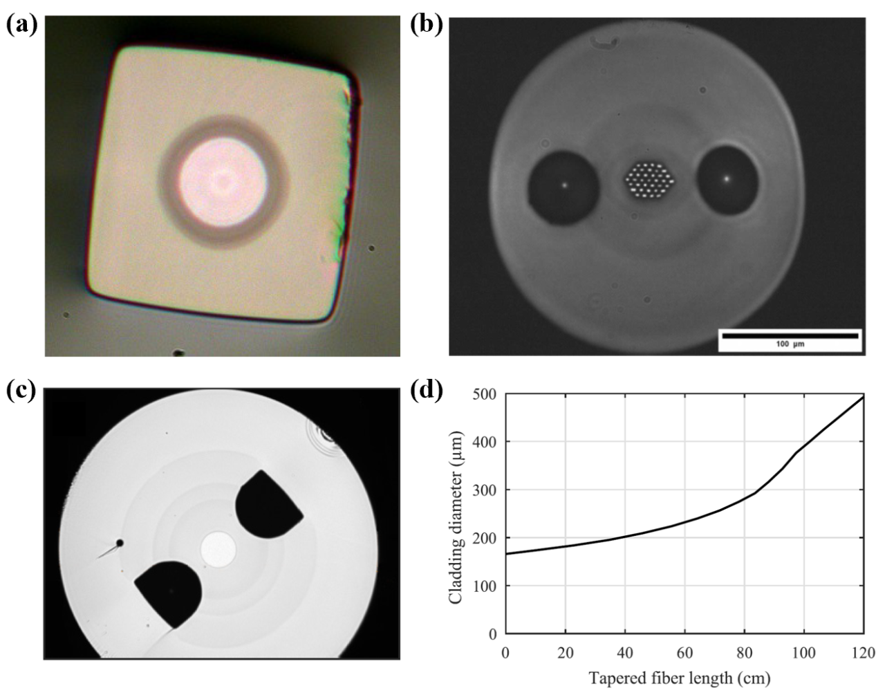 图1 大模场有源光纤结构设计。(a)基于PAS玻璃体系的35/115 μm×115 μm掺铒石英光纤截面图;(b)纤芯数量为39芯、纤芯区域尺寸为24 μm×32 μm的铒镱共掺多芯光纤截面图;(c)保偏掺镱锥形光纤截面图;(d)锥形光纤包层直径随光纤长度变化趋势