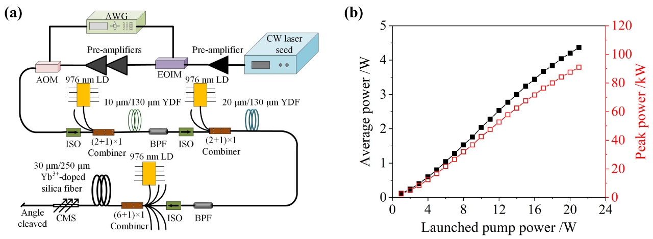 图3 基于大模场掺镱石英光纤实现的峰值功率91 kW、脉冲宽度2.4 ns的脉冲单频光纤激光