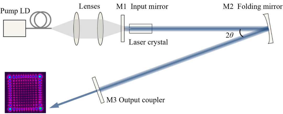 基于该思路,设计了折叠腔结构实验方案(图1),利用凹面折叠镜在子午面和弧矢面有效焦距各自随入射角变化的特性引入像散。相较于使用柱面光学元件引入像散,折叠腔的像散程度可通过改变折叠角进行主动调节,灵活性更高。引入像散后,谐振腔的本征模被限定为沿两个像散对称轴方向(x和y方向)的HG模式,而倾斜HG模式不能自再现,也就消除了竞争,使得简单的二维离轴泵浦能够直接激发二维的HGm,n模式。