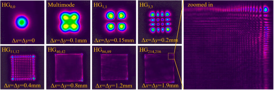 实验中模式阶次随泵浦光位置的变化规律与基于交叠积分计算得到理论预期一致。当878.6 nm泵浦光功率2 W时,1064 nm Nd:YVO4激光器在Δx=Δy=1.9 mm(~13.6倍基模光斑半径)时实现了最高达HG214,216的超高阶输出。HG214,216的阈值仅为1.74 W,斜效率为13.4%。这是首次实现超高阶的二维HG模式光束,也是主动方法产生的最高阶模式激光(HGm,n模式阶数N=m+n,LGp,l 模式阶数N=2p+l,此前公开报道中主动方法产生的最高阶模式激光为该课题组利用腔内球差选模产生的LG0,355)。