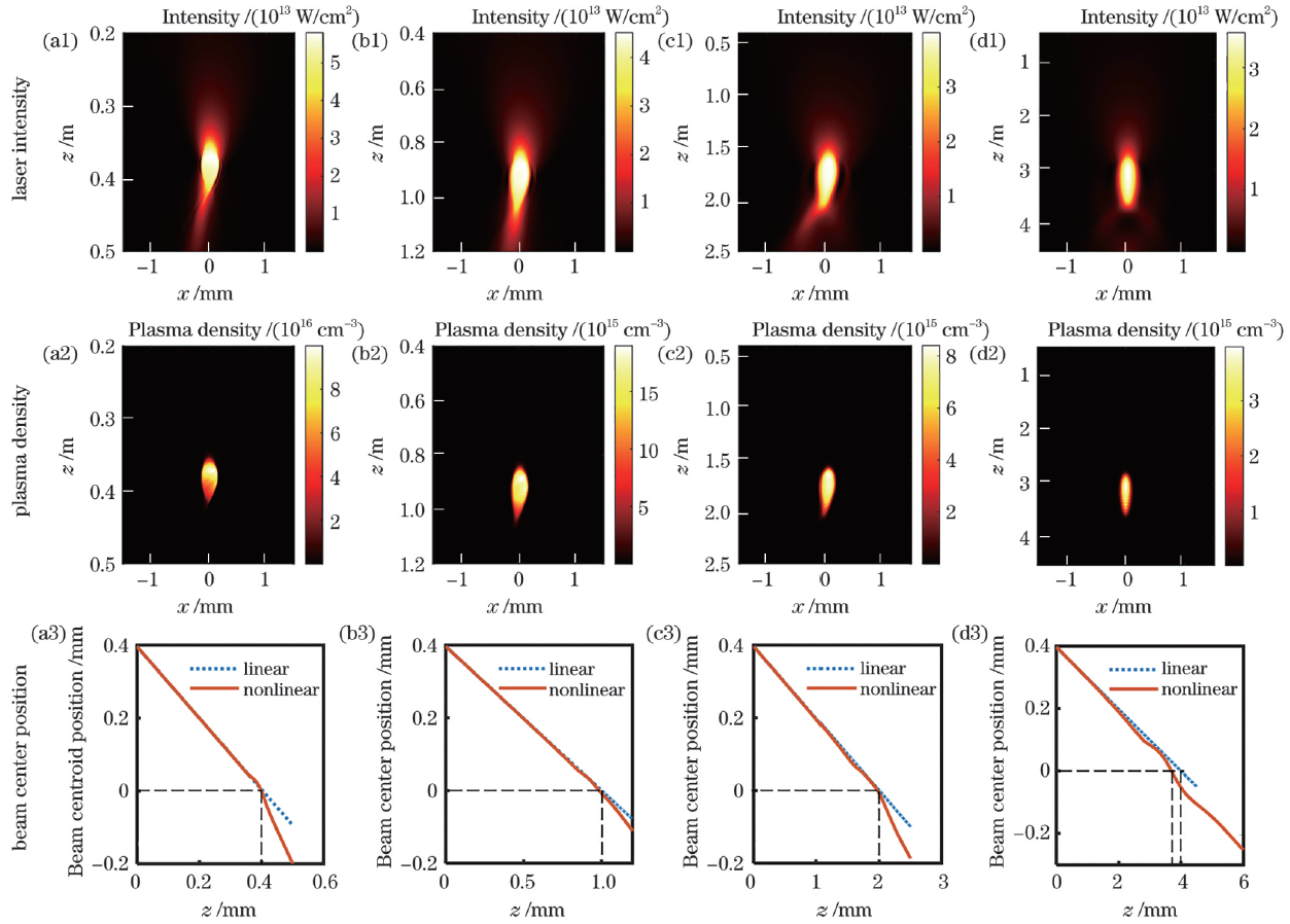 图2 不同数值孔径下非对称光斑成丝情况。(a1) (a2) (a3) NA 为1/200;(b1) (b2) (b3) NA为1/500;(c1) (c2) (c3) NA为1/1000;(d1) (d2) (d3) NA 为1/2000