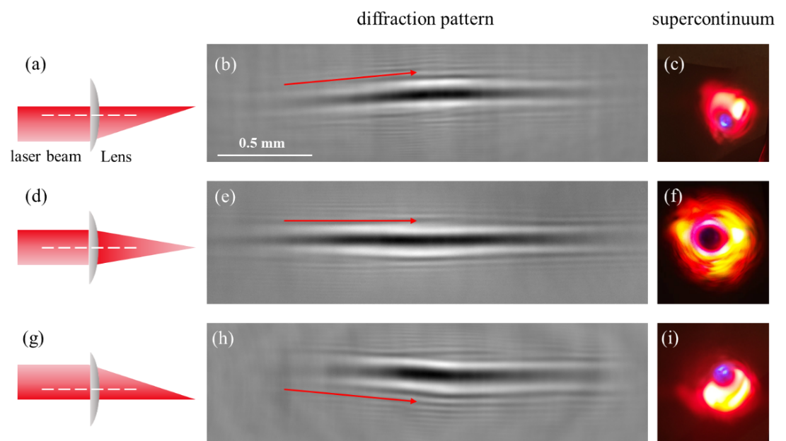 图3 弯曲光丝的产生及其辐射的超连续谱。(a) ~ (c) 激光光斑在透镜上偏心-2.5 mm;(d) ~ (f) 激光光斑在透镜上未偏心0 mm;(g) ~ (i) 激光光斑在透镜上偏心2.5 mm
