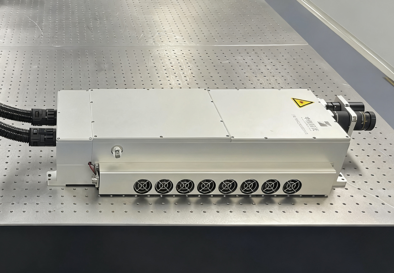 为满足雷达系统对环境适应性的严苛要求,研究团队通过严格工程化设计,成功研制出四波长激光器样机,如图2所示。该激光器系统采用高效风冷散热方案,确保其在复杂环境下的稳定运行。激光器输出光束涵盖紫外与可见光波段,各波长经过精密扩束系统处理,实现两两并行输出,为雷达探测提供多光谱支持。
