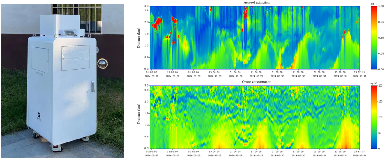 研究团队采用防水密封合理化设计的恒温方舱搭载雷达核心机,实现了在1小时内完成指定地点地基探测系统的额快速部署。该户外型臭氧激光雷达系统在陕西省咸阳市开展的地基探测实验中,成功获取了气溶胶消光系数与臭氧浓度的垂直廓线,如图4所示。实验结果有效揭示了边界层内臭氧与气溶胶的垂直分布系统变化特征。该成果验证了激光雷达系统在野外环境下的环境适应性与数据可靠性,为区域大气污染立体监测提供了坚实的技术支撑。