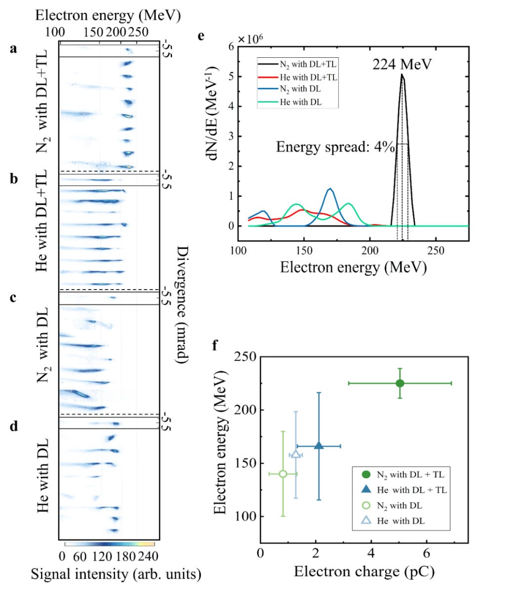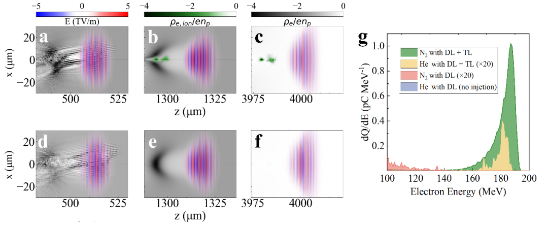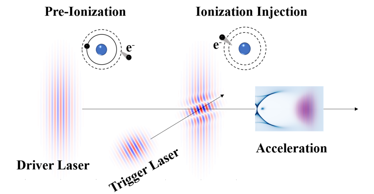 激光尾波场加速(Laser Wakefield Acceleration, LWFA)凭借比传统加速器高出千倍以上的加速梯度,有望推动加速器朝着小型化、低成本的方向变革,在新型辐射源、医学成像、肿瘤放疗等领域潜力巨大。然而,电子束注入机制在很大程度上决定了最终电子束的能量、能散和稳定性。 离化注入机制因其能够稳定地产生大电量电子束而被广泛应用,但气体持续离化导致的连续注入过程,使得离化注入机制得到的电子通常为连续宽谱,限制了其在高精度物理实验和紧凑型光源中的应用。如何在保持注入稳定性的同时,实现可控制截止的离化注入,一直是激光等离子体加速领域的重要挑战。 研究创新点 图1 剪式交叉离化注入的物理机制示意 本工作中,研究团队实验验证了一种新型的剪式交叉离化注入方案,该理论方案于2022年由李大章研究员、曾明特聘研究员团队提出[3]。该方法通过引入一束触发激光,与驱动激光在等离子体中以约30°夹角交叉,使两束激光的叠加电场仅在极小的时空区域内超过原子内层电子的离化阈值,从而触发局域、瞬态的离化注入过程(图1)。 与传统连续离化注入不同,该机制能够在注入窗口关闭后迅速终止离化电子和注入,使被捕获电子几乎在同一加速相位进入尾波场,有效抑制了能散展宽问题。该方案通过双激光时空同步实现,对实验实现具有良好的兼容性和可扩展性。 实验结果与验证 图2 剪式交叉离化注入条件下的电子能谱与统计结果 在实验中,研究团队系统比较了不同气体类型及不同激光配置下的电子注入行为。结果表明,当采用氮气并开启触发激光时,剪式交叉离化注入能够稳定地产生准单能电子束(图2)。相比之下,传统的碰撞注入、自注入或单激光条件下,电子束普遍表现出能谱展宽大、稳定性差等问题。进一步的时间延迟扫描实验显示,通过精确调控两束激光的飞秒级时间延迟,可以灵活调节电子束的电荷量与能谱特性,充分体现了该注入机制的可控性。 数值模拟与机理分析 图3 剪式交叉离化注入的PIC模拟结果 为深入理解实验结果,研究团队开展了Particle-in-Cell数值模拟。模拟结果显示,电子主要来源于氮原子内层电子的离化注入,且注入区域高度局域化。由于注入长度在微米量级,电子在随后的加速过程中始终处于相近的加速相位,从而形成准单能能谱。模拟结果与实验观测高度一致,进一步验证了剪式交叉离化注入在抑制连续注入、提升电子束品质方面的独特优势(图3)。 在此项计算机模拟工作过程中,研究团队提出了用预设电磁场时空分布模拟斜入射激光的模拟算法。目前准柱坐标的PIC模拟算法已经成为LWFA的主流模拟方法,其在保持与全三维模拟算法相同的准确性的前提下,将模拟效率提高了2到3个数量级。但是准柱坐标的PIC算法在碰到大大偏离柱对称的问题时会失效,比如此项工作中存在斜入射激光的情况。我们研究发现,在斜入射激光与主激光作用范围较小(10微米量级)的情况下,可在准柱坐标的PIC算法中用解析的电磁场分布代替斜入射激光,从而同时保持模拟的高效率和准确性。在这个新算法的帮助下,我们实现了对实验结果的高效率模拟复现。该粒子模拟方法发表在Phys. Rev. Accel. Beams 28, 021301 (2025)。 总结与展望 该研究首次在实验中验证了剪式交叉离化注入机制的可行性与优势,成功解决了传统离化注入中连续注入导致能散展宽的关键问题。该方法通过局域电场叠加实现可控的局域注入,为获得高电荷、低能散、高重复性电子束提供了一种全新的技术路径。未来,该注入机制将在推动紧凑型激光粒子加速器AI智能化、先进光源优化及强场QED物理研究等方面发挥重要作用,并有望为高品质电子束在肿瘤细胞精准放疗方面的研究提供有力支撑。