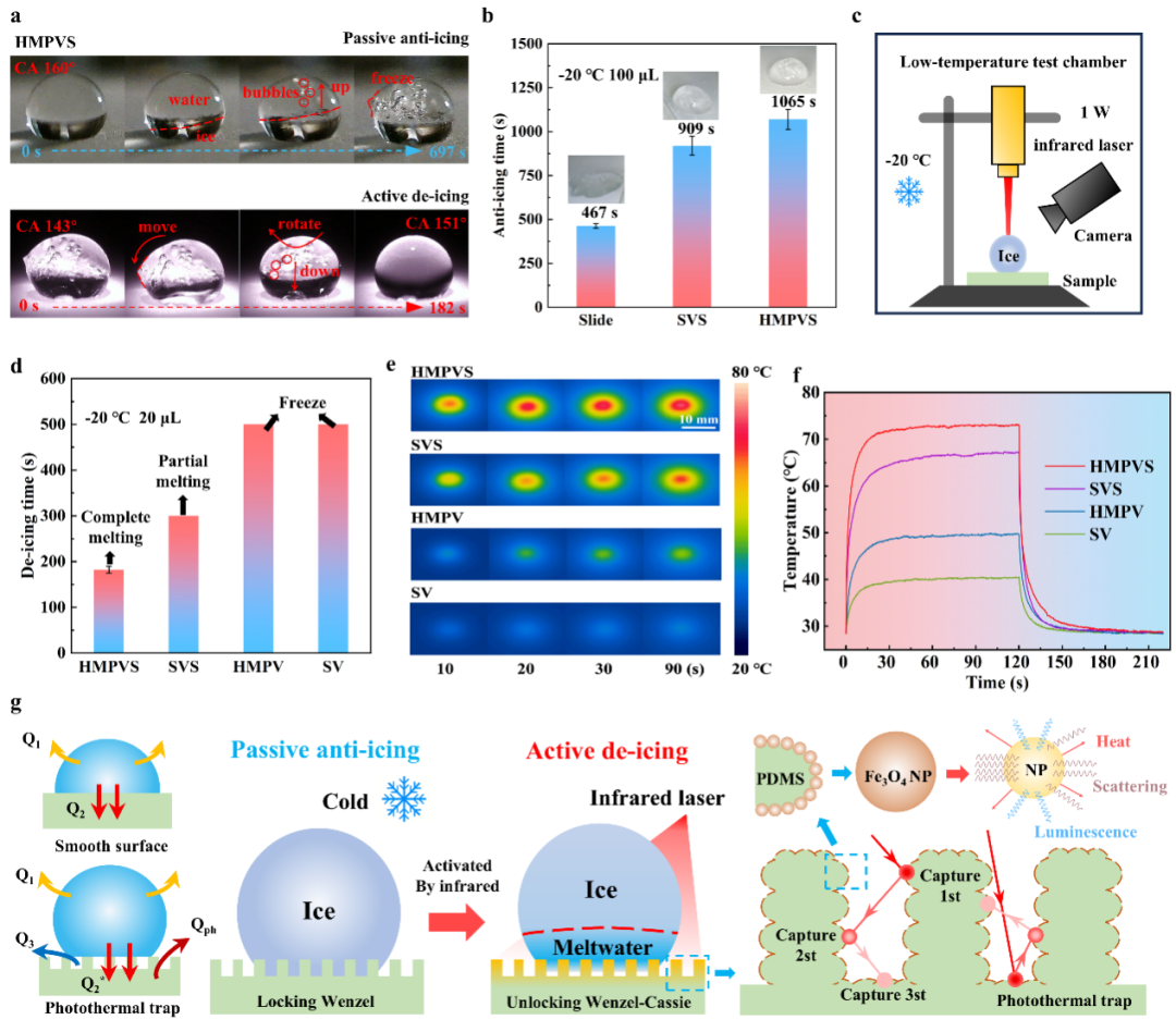 在不同表面结冰时间对比 在蜂窝轮廓结构、内部的微柱阵列以及Fe3O4光热颗粒的协同作用下,表面结冰时间显著提升,相较于原始表面结冰时间延缓2.14倍。 03. 后续工作
