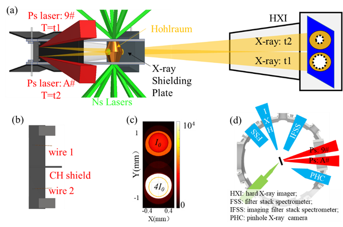 为突破这一限制,建设多束大能量皮秒激光装置成为了发展多时刻高能X射线背光照相技术的关键。中国科学院上海光学精密机械研究所的神光II升级装置具备16束纳秒激光与2束皮秒激光联合打靶的实验能力。基于该装置可发展双时刻高能X射线背光照相技术,但仍需解决双时刻皮秒X射线源的产生与表征、抗串扰的照相靶设计等关键问题。