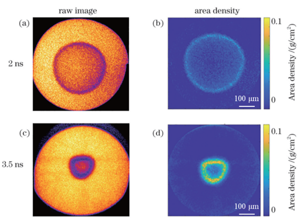图2 内爆靶丸双时刻照相图像。(a) 和 (c) 分别为2 ns和3.5ns 时刻的高能X射线照相图像;(b) 和 (d) 为对应时刻的面密度分布