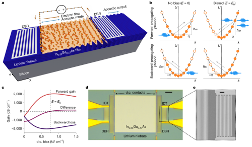 近日,桑迪亚国家实验室Alexander Wendt,Matt Eichenfield等在Nature上发文,提出了一种全固态、单片集成的声表面波声子激光器,该器件由铌酸锂声表面波谐振器与内置直流电注入宽带半导体增益介质构成,器件面积小于0.15 mm²。