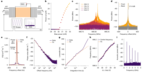 在36 V阈值偏压以下时,该器件表现为谐振放大器;超过阈值偏压后,器件呈现自维持相干振荡、线宽窄化与高输出功率特性。在1 GHz频率下,该器件可产生高达-6.1 dBm的连续片上声输出功率,分辨率极限线宽小于低于77 Hz,在1 kHz频偏处的载波相位噪声为-57 dBc/Hz。